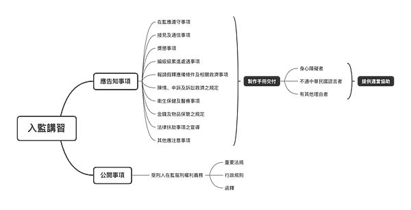 新收入監講習為使受刑人能更快暸解監內生活,並告知其應遵守的規定和權利義務,以利監獄提供適當的協助,幫助受刑人於服刑期間能夠對於相關規定有一定程度的瞭解,並於入監之時由監方製作「受刑人生活手冊」,每舍房至少一本,供受刑人閱讀。接下來針對入監講習的內容及提供協助事項說明如下: